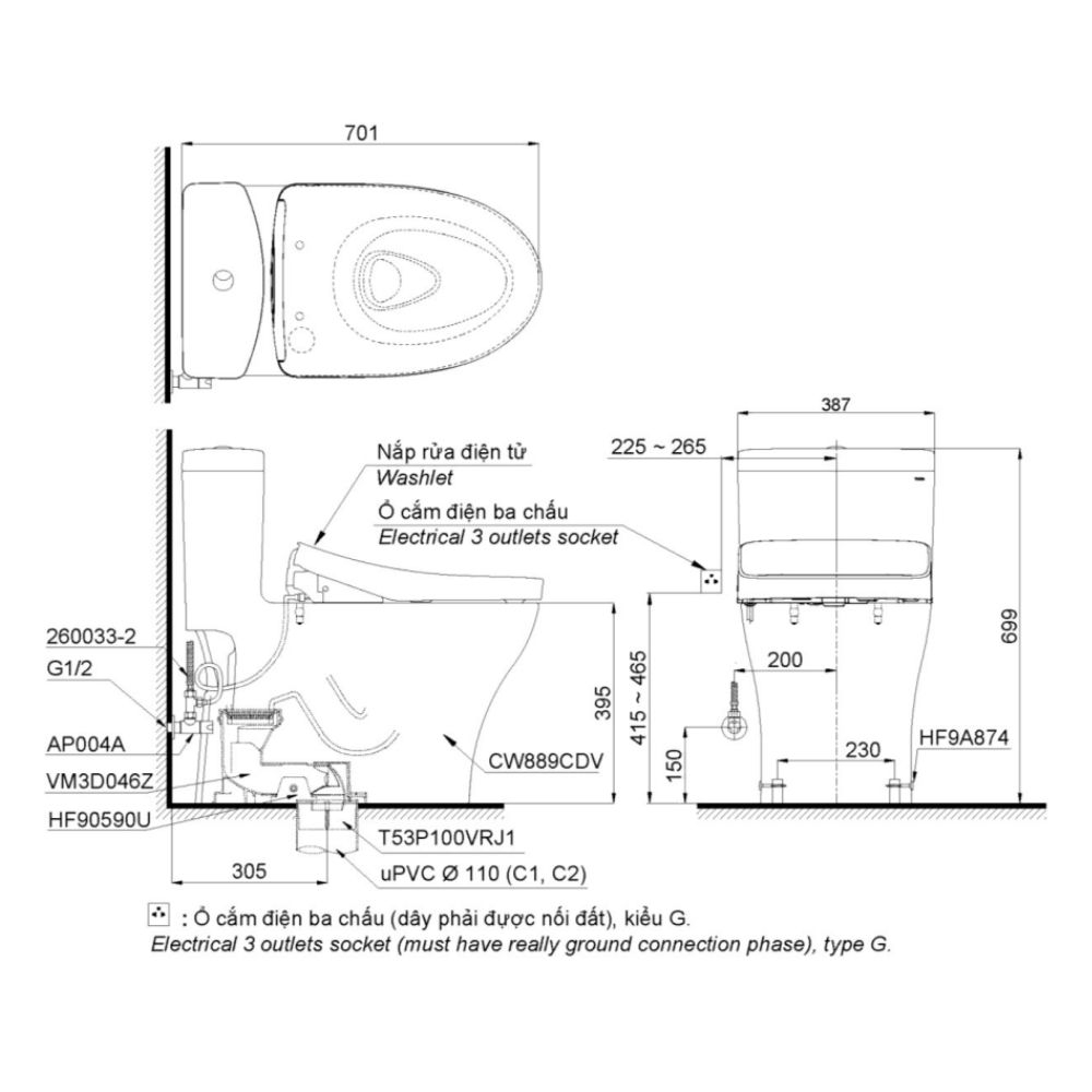 Bản vẽ kỹ thuật bồn cầu 1 khối nắp điện tử TOTO MS889CDRW24 giấu dây
