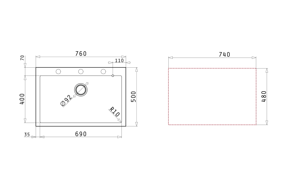 • Kích thước cắt đá: 740 x 480 mm